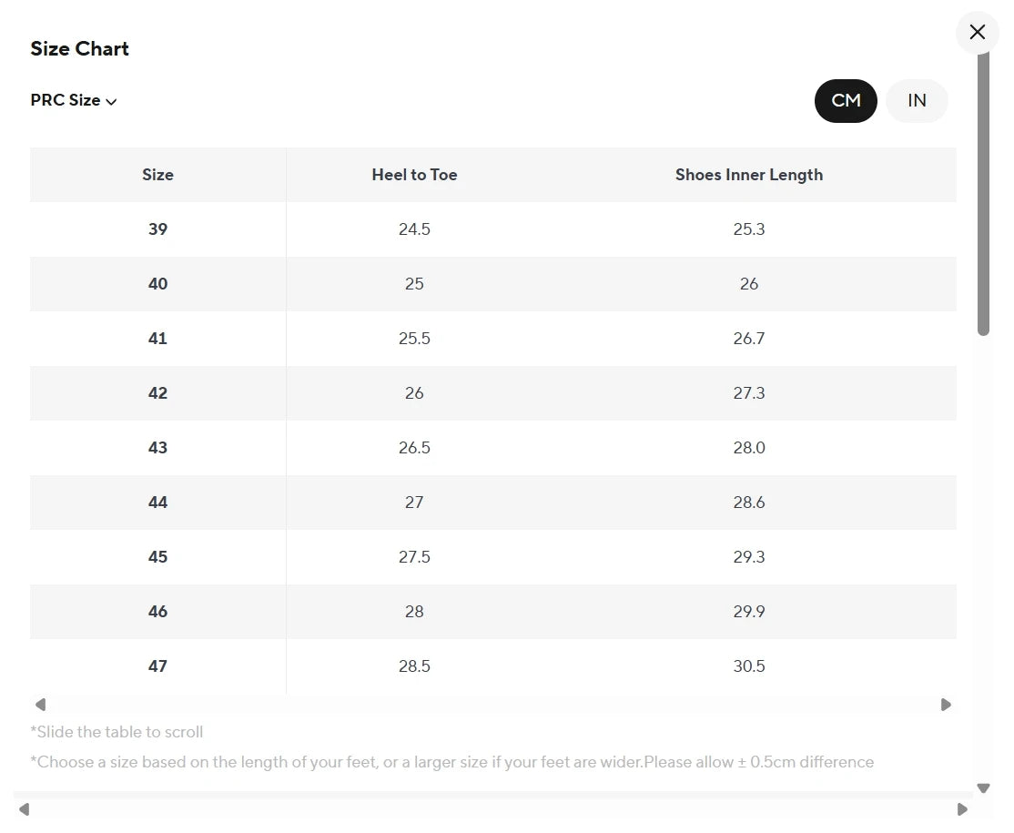 size_info: {"sizeInfoList":[{"length":{"cm":"24.5","inch":"9.65"},"size":"39.5","vid":-1},{"length":{"cm":"25","inch":"9.84"},"size":"40","vid":-2},{"length":{"cm":"25.5","inch":"10.04"},"size":"41","vid":-3},{"length":{"cm":"26","inch":"10.24"},"size":"42","vid":-4},{"length":{"cm":"26.5","inch":"10.43"},"size":"43","vid":-5},{"length":{"cm":"27","inch":"10.63"},"size":"44","vid":-6},{"length":{"cm":"27.5","inch":"10.83"},"size":"45","vid":-7},{"length":{"cm":"28","inch":"11.02"},"size":"45.5","vid":-8},{"length":{"cm":"28.5","inch":"11.22"},"size":"46.5","vid":-44}]}