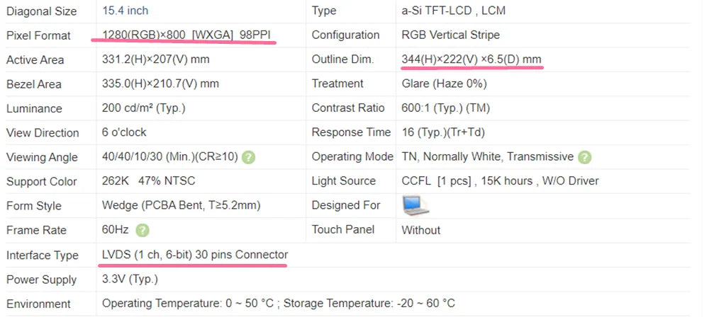 MODEL: B154EW08,LTN154AT02,N154I3,LP154WX4 LP154WX5